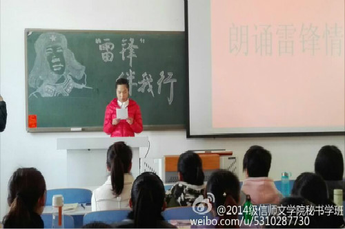 本次班会组织到位、主题鲜明、形式多样。或观看雷锋纪录片,增强同学们对雷锋精神的理解和认识,重温雷锋精神的深刻内涵;或合唱《学习雷锋好榜样》,朗诵《雷锋情》,表达对雷锋的崇敬之情。或进行精彩的小品表演《人人都爱学雷锋》寓教于乐,引导同学们树立社会责任感,从身边小事做起践行雷锋精神。2014级秘书学班的宣誓慷慨激昂,2013级汉语言文学1班进行雷锋知识抢答,同学们踊跃发言,班会高潮迭起。